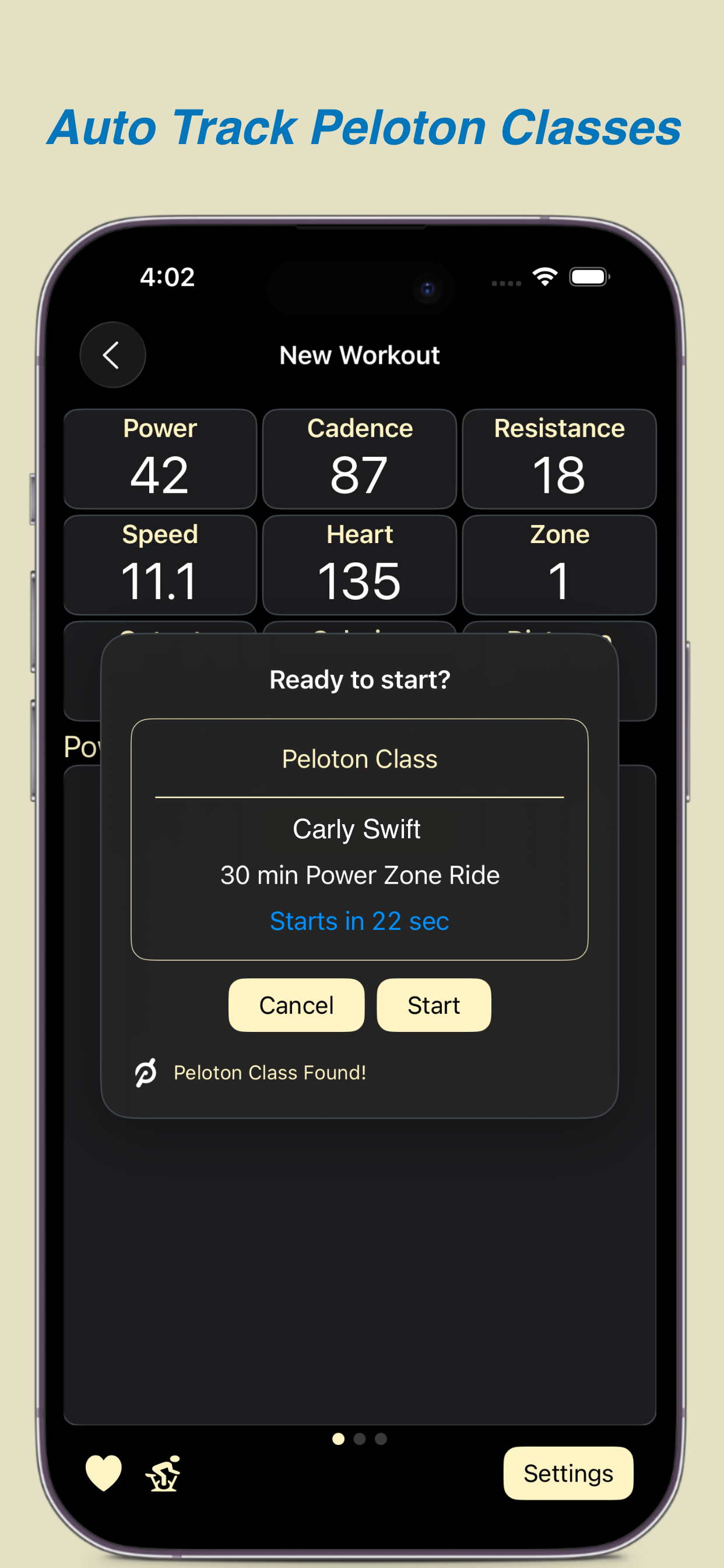 To customize the live class experience or adjust the New Workout display, tap the Settings button in the bottom-right corner of the screen.