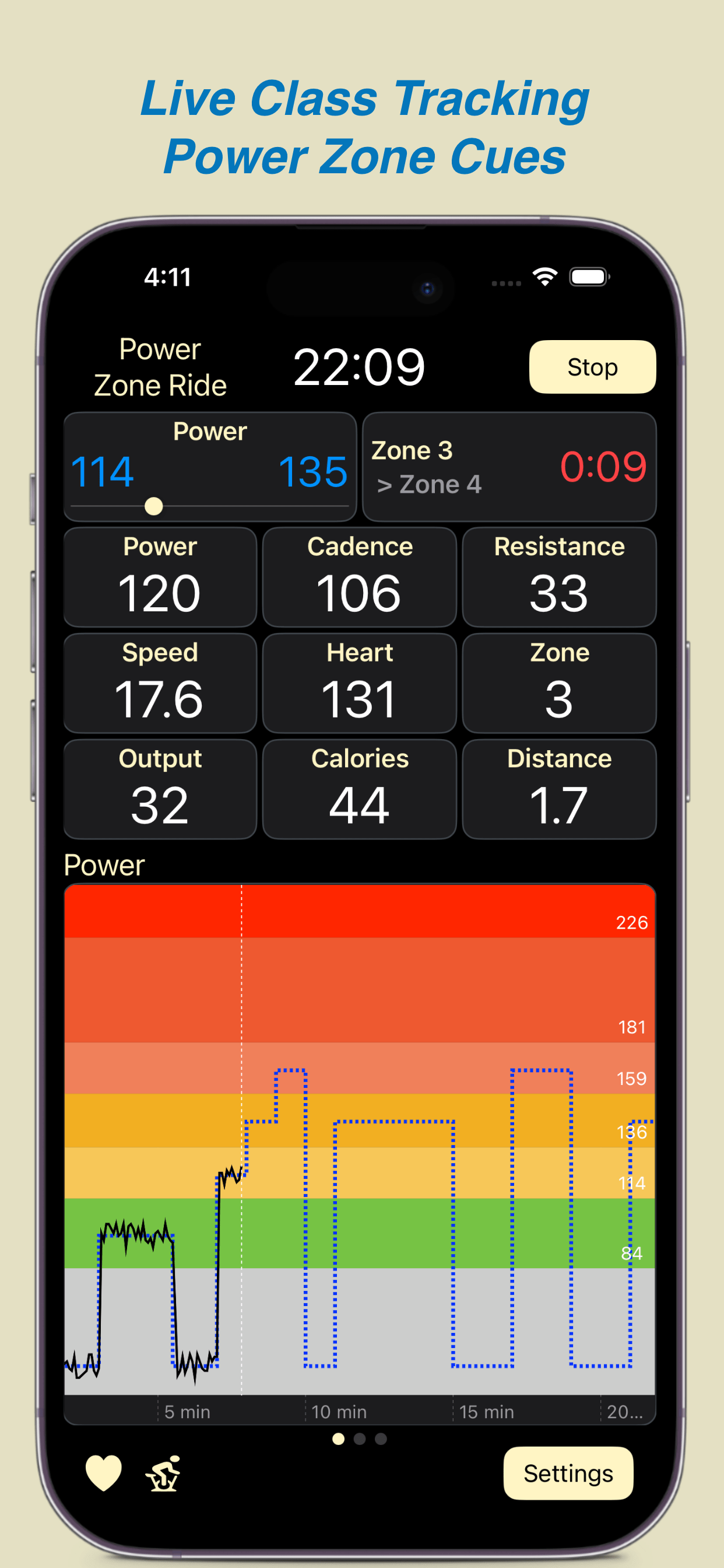 For Cycling and Rowing classes, you’ll see a blue dotted line representing the class’s Power structure. As the class progresses, your actual power output is plotted on top of this structure, making it easy to see how closely you’re following the instructor’s targets.